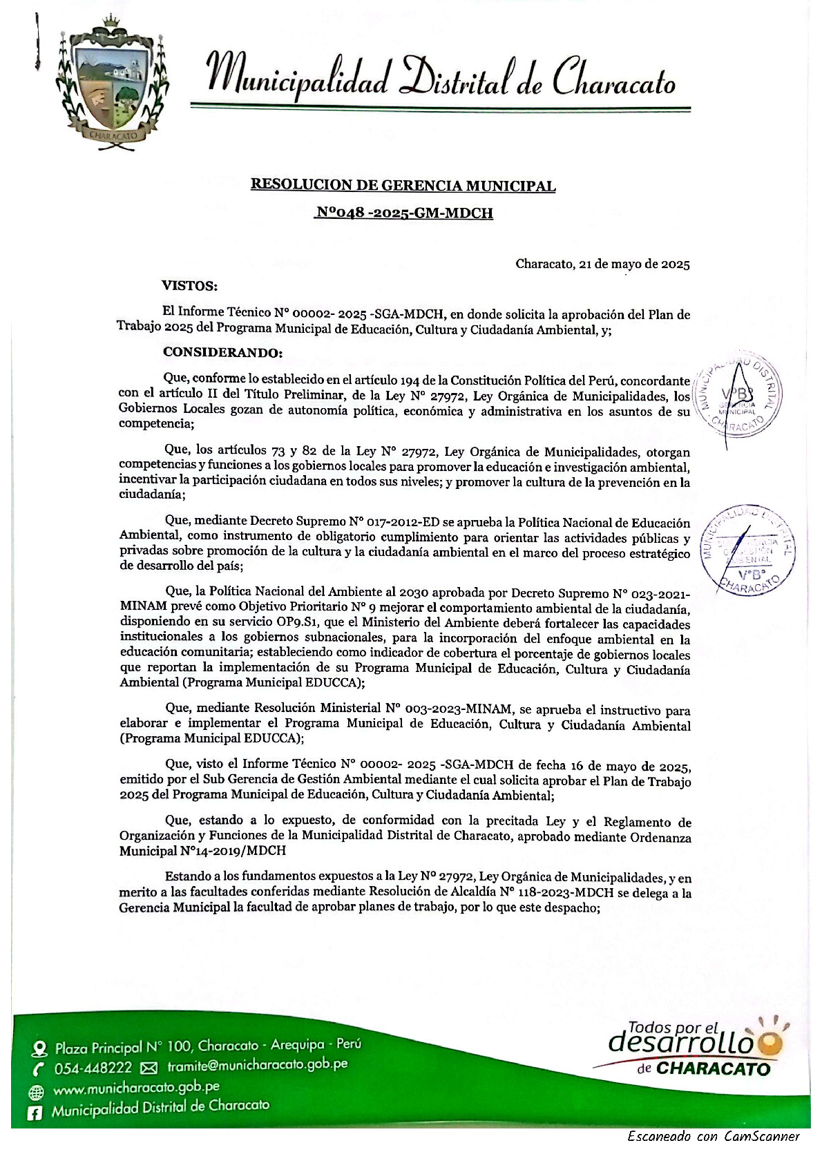 La presente Resolución de Gerencia Municipal aprueba el Plan de Trabajo 2025 del Programa Municipal de Educación, Cultura y Ciudadanía Ambiental de la Municipalidad Distrital de Characato – Arequipa (Arequipa), con la finalidad de definir las actividades de educación, cultura y ciudadanía ambiental que se desarrollaran en la localidad durante el presente año.
