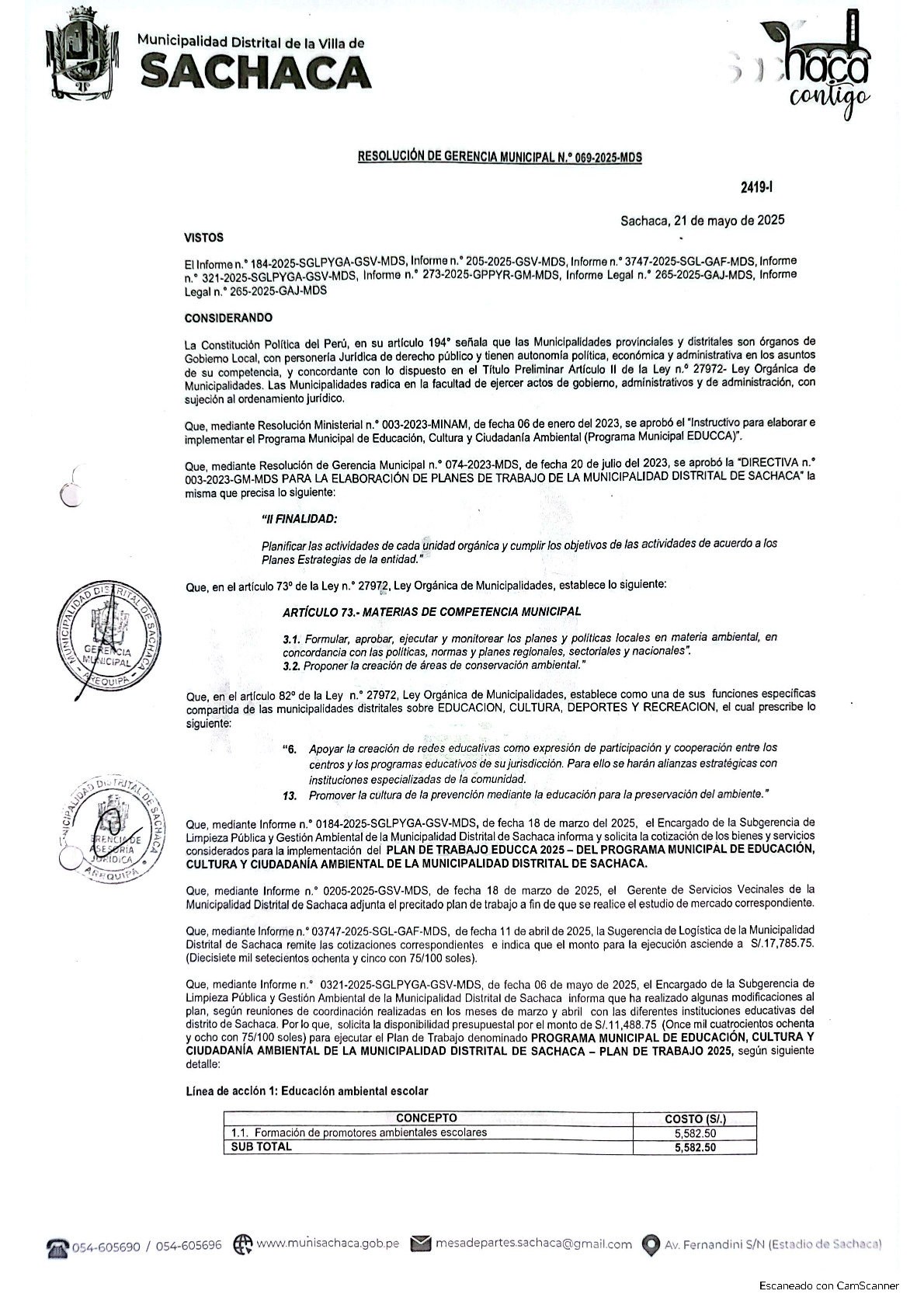 La presente Resolución de Gerencia Municipal aprueba el Plan de Trabajo 2025 del Programa Municipal de Educación, Cultura y Ciudadanía Ambiental de la Municipalidad Distrital de Sachaca – Arequipa (Arequipa), con la finalidad de definir las actividades de educación, cultura y ciudadanía ambiental que se desarrollaran en la localidad durante el presente año.