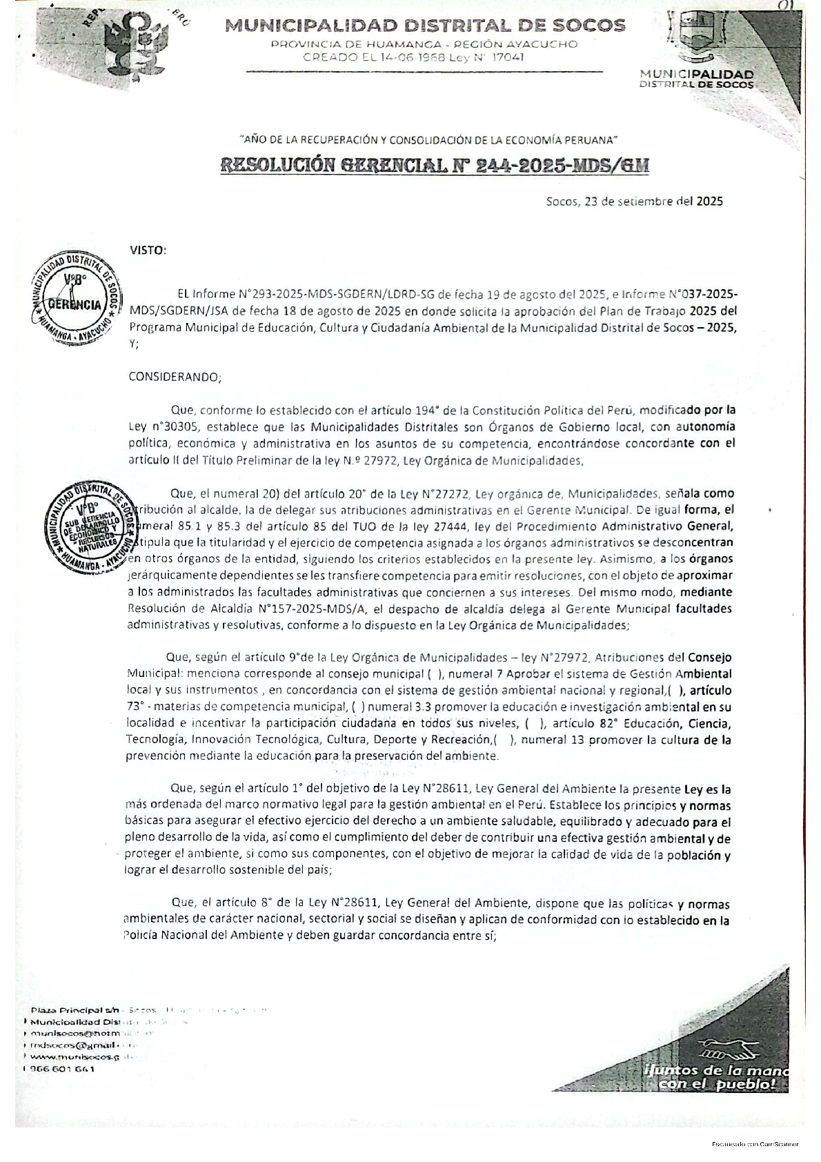 La presente Resolución de Gerencia Municipal aprueba el Plan de Trabajo 2025 del Programa Municipal de Educación, Cultura y Ciudadanía Ambiental de la Municipalidad Distrital de Socos – Huamanga (Ayacucho), con la finalidad de definir las actividades de educación, cultura y ciudadanía ambiental que se desarrollarán en la localidad durante el presente año.