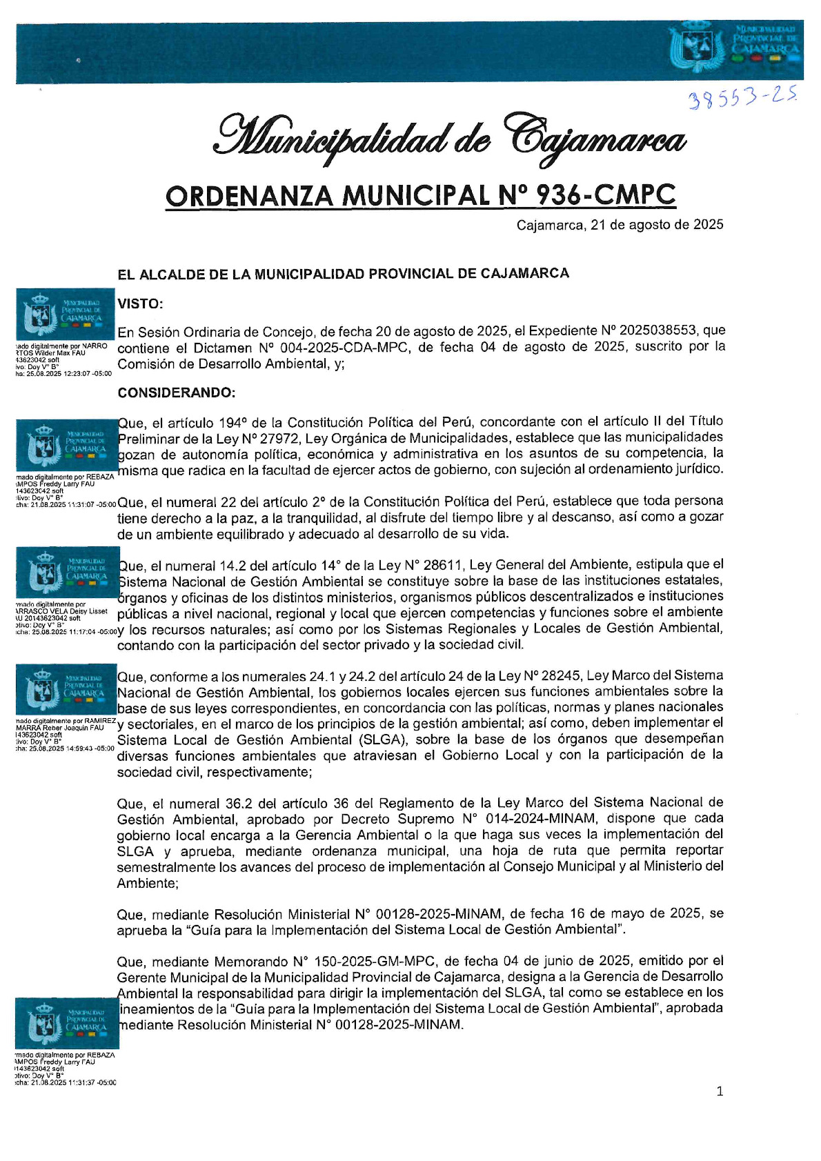 Ordenanza Municipal que Aprueba la Matriz Local de Prioridades Ambientales y Climáticas de la Municipalidad Provincial de Cajamarca
