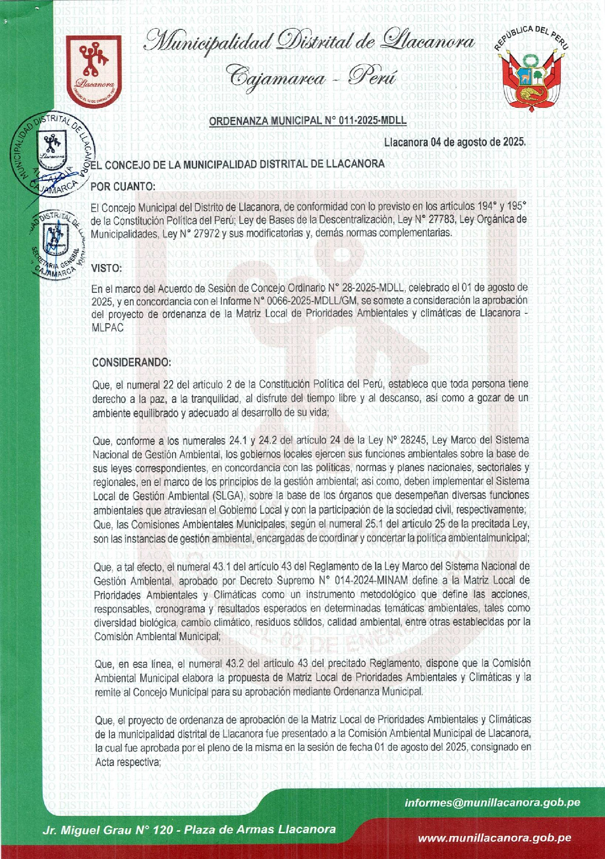 Ordenanza Municipal que Aprueba la Matriz Local de Prioridades Ambientales y Climáticas del Distrito de Llacanora