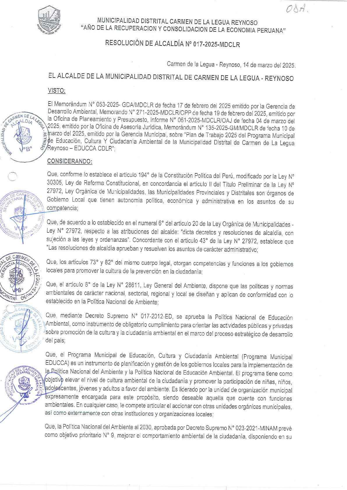 La presente Resolución de Alcaldía aprueba el Plan de Trabajo 2025 del Programa Municipal de Educación, Cultura y Ciudadanía Ambiental de la Municipalidad Distrital de Carmen de la Legua Reynoso (Callao), con la finalidad de definir las actividades de educación, cultura y ciudadanía ambiental que se desarrollaran en la localidad durante el presente año.
