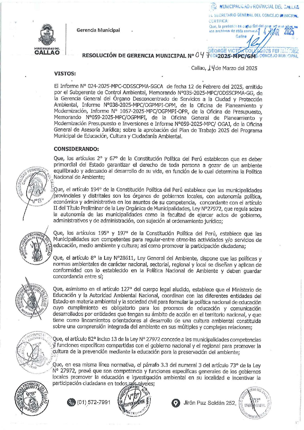 La presente Resolución de Gerencia Municipal aprueba el Plan de Trabajo 2025 del Programa Municipal de Educación, Cultura y Ciudadanía Ambiental de la Municipalidad Provincial del Callao (Callao), con la finalidad de definir las actividades de educación, cultura y ciudadanía ambiental que se desarrollaran en la localidad durante el presente año.