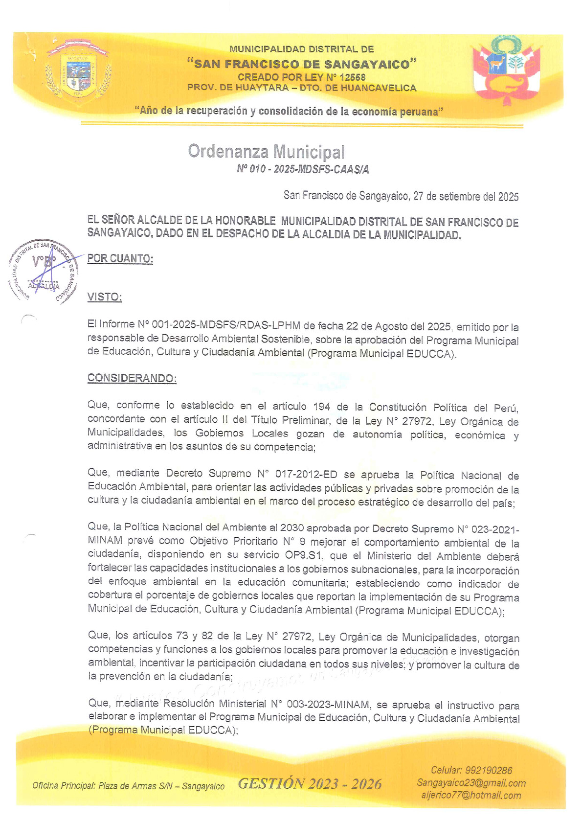 La presente Ordenanza aprueba el Programa Municipal de Educación, Cultura y Ciudadanía Ambiental de la Municipalidad Distrital de San Francisco de Sangayaico – Huaytará (Huancavelica), con la finalidad de promover la cultura y la educación ambiental para la formación de ciudadanas y ciudadanos ambientalmente responsables e incentivar la participación ciudadana en todos sus niveles.