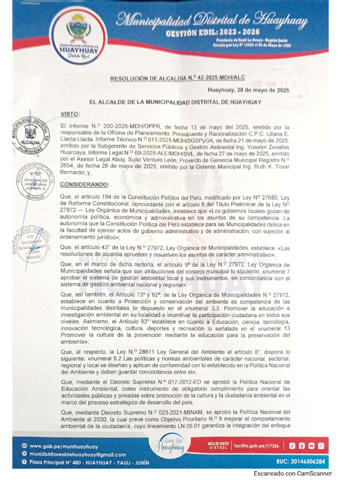 La presente Resolución de Alcaldía aprueba el Plan de Trabajo 2025 del Programa Municipal de Educación, Cultura y Ciudadanía Ambiental de la Municipalidad Distrital de Huayhuay –Yauli (Junín), con la finalidad de definir las actividades de educación, cultura y ciudadanía ambiental que se desarrollaran en la localidad durante el presente año.