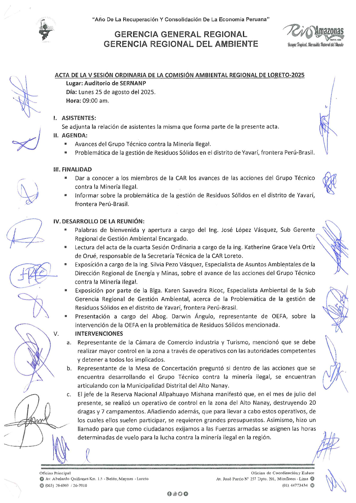 La V Sesión Ordinaria de la Comisión Ambiental Regional (CAR) Loreto, realizada el 25 de agosto de 2025, tuvo como objetivo informar sobre dos problemas ambientales críticos: