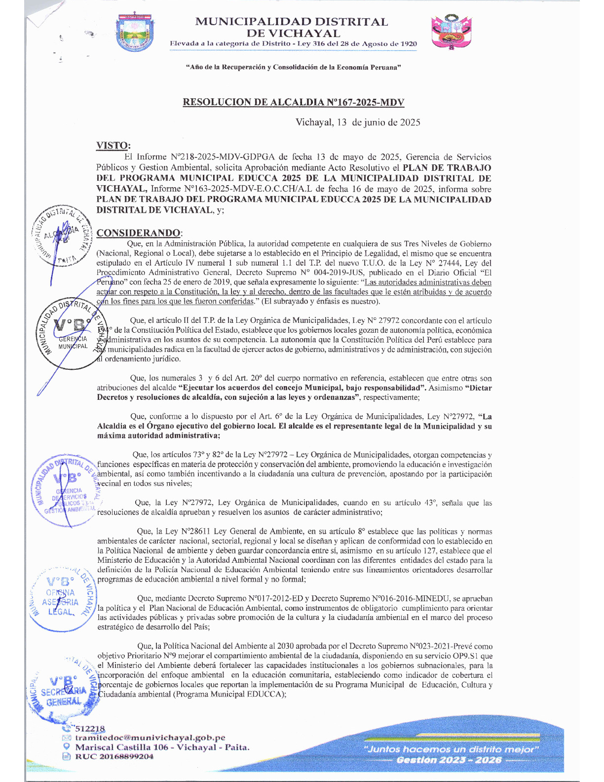 La presente Resolución de Alcaldía aprueba el Plan de Trabajo 2025 del Programa Municipal de Educación, Cultura y Ciudadanía Ambiental de la Municipalidad Distrital de Vichayal -Paita (Piura), con la finalidad de definir las actividades de educación, cultura y ciudadanía ambiental que se desarrollaran en la localidad durante el presente año.