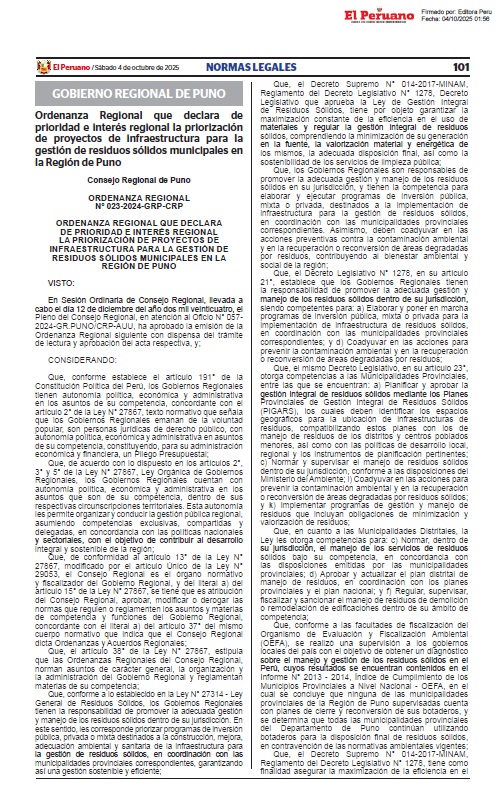 Ordenanza Regional que declara de prioridad e interés regional la priorización de proyectos de infraestructura para la gestión de residuos sólidos municipales en la Región de Puno