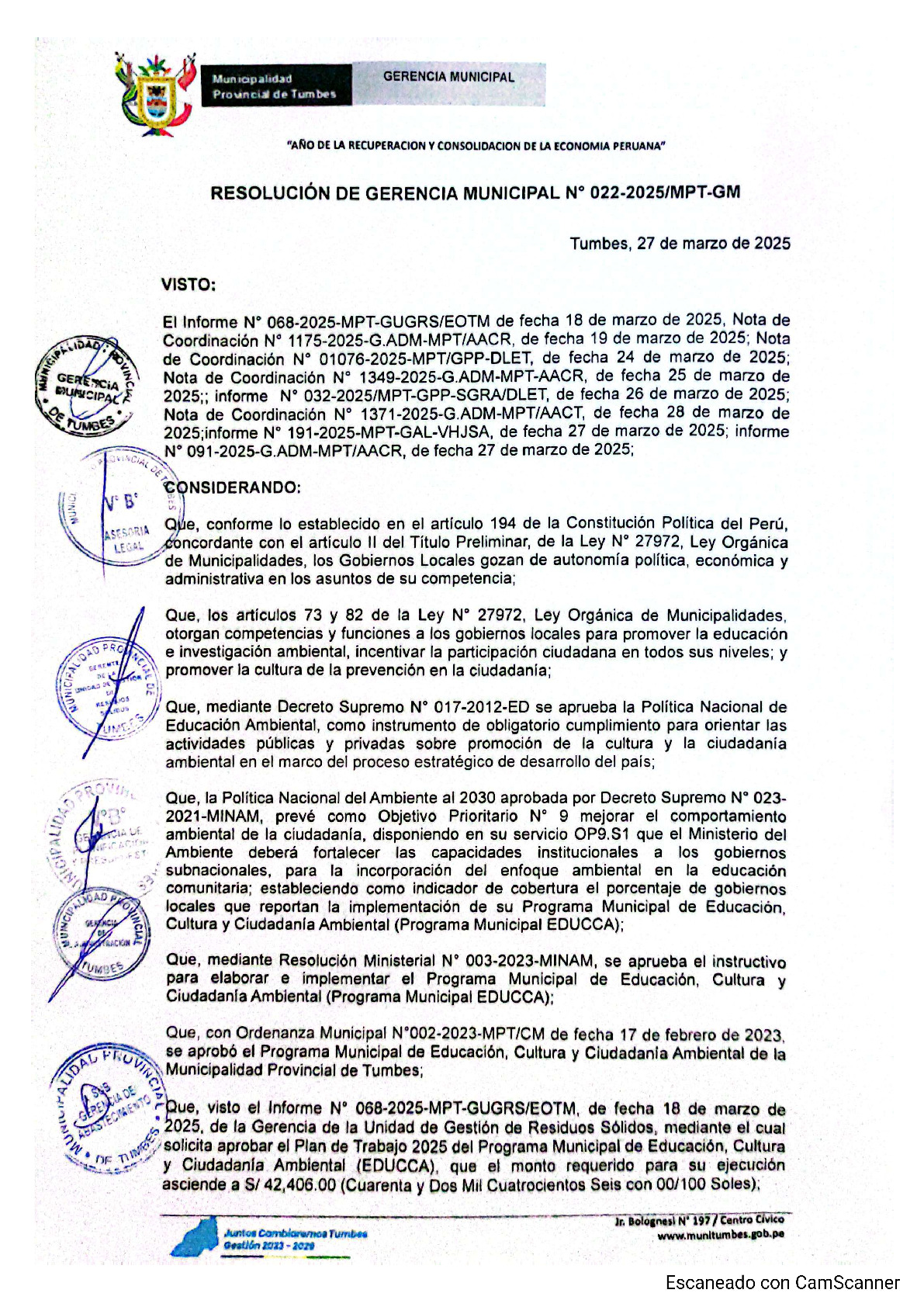 La presente Resolución de Gerencia Municipal aprueba el Plan de Trabajo 2025 del Programa Municipal de Educación, Cultura y Ciudadanía Ambiental de la Municipalidad Provincial de Tumbes – Tumbes (Tumbes), con la finalidad de definir las actividades de educación, cultura y ciudadanía ambiental que se desarrollaran en la localidad durante el presente año.